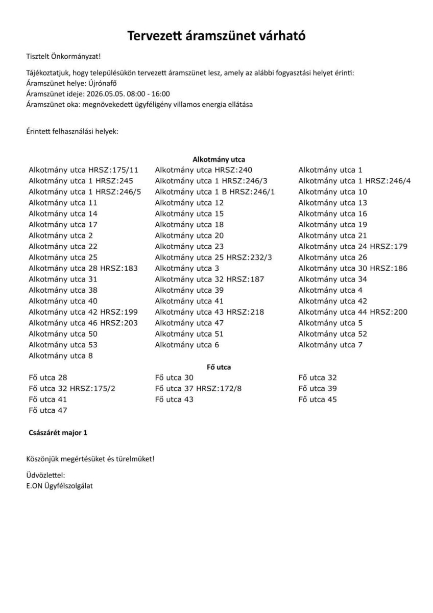 Tervezett áramszünet május 5-én